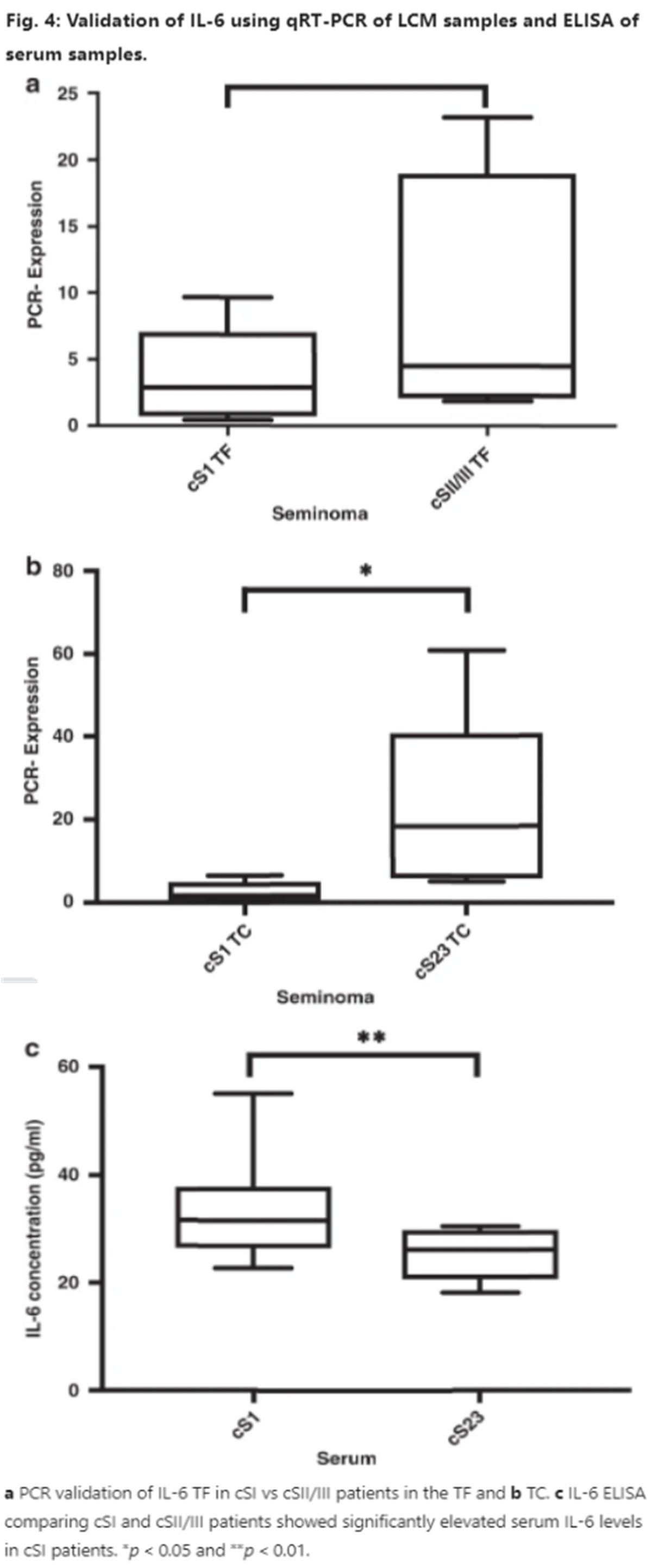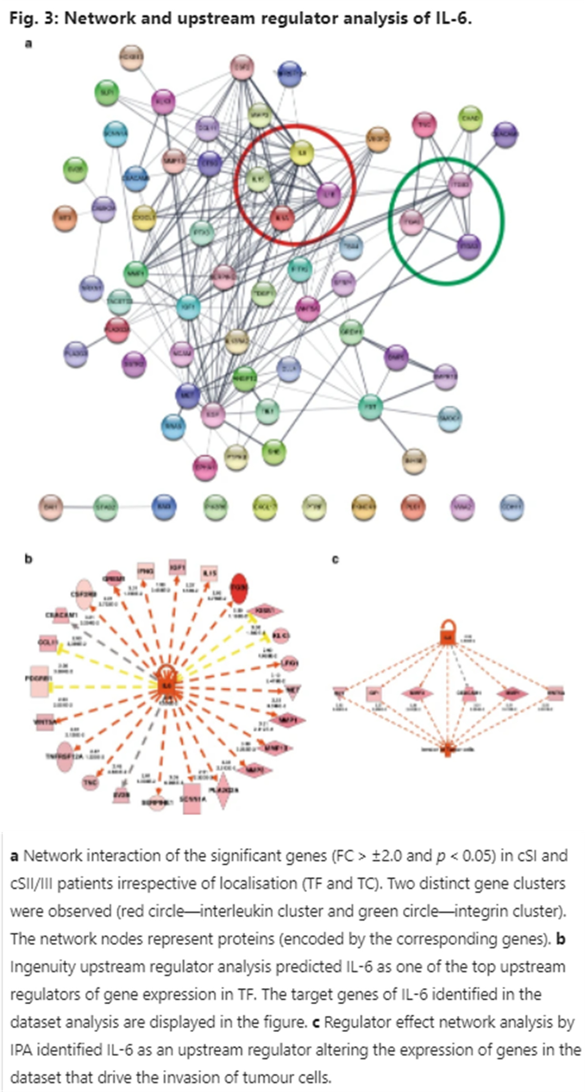 使用激光捕獲顯微切割分別收集非轉(zhuǎn)移性(監(jiān)測(cè)和無(wú)復(fù)發(fā)隨訪>2年)和轉(zhuǎn)移性STGCT的定義區(qū)域見(jiàn)圖一[侵襲性腫瘤前沿(TF)和腫瘤中心(TC]。使用nCounter技術(shù)分析與腫瘤進(jìn)展和轉(zhuǎn)移相關(guān)的760個(gè)基因的表達(dá),并通過(guò)定量實(shí)時(shí)PCR和酶聯(lián)免疫吸附測(cè)定進(jìn)行驗(yàn)證。實(shí)驗(yàn)結(jié)果顯示,基因表達(dá)分析揭示了cSII/III患者免疫通路的上調(diào)見(jiàn)圖二);綜合分析顯示cSII/III患者IL-6和整合素信號(hào)上調(diào)(見(jiàn)圖三);上游分析預(yù)測(cè)腫瘤侵襲受IL-6調(diào)控(見(jiàn)圖三);驗(yàn)證TFTC中的IL-6表達(dá)(見(jiàn)圖四)。