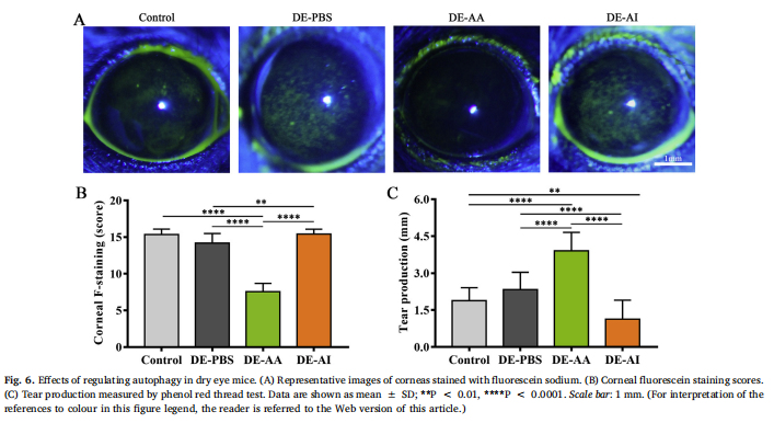 此次動(dòng)物實(shí)驗(yàn)通過(guò)測(cè)定DE小鼠角膜自噬的發(fā)生和激活,探討角膜自噬與DED眼表炎癥之間的關(guān)系。該研究還評(píng)估了自噬激活劑和自噬抑制劑對(duì)這些小鼠自噬、炎癥抑制劑的表達(dá)和DE癥狀的影響。