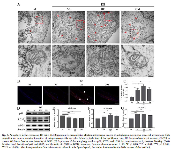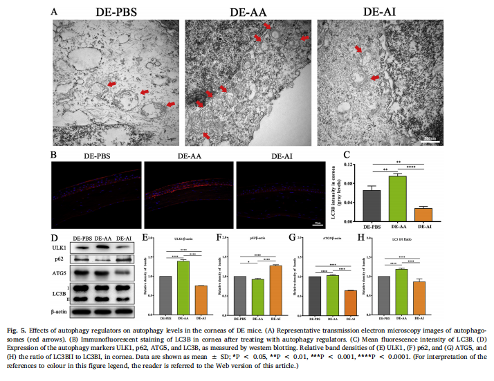 干眼病(DED)是一種多因素的眼表疾病,影響全球數(shù)百萬(wàn)人,其特征是眼表炎癥和損傷。目前尚不清楚角膜自噬是否參與DED中觀察到的眼表炎癥。為了測(cè)試這種參與,干眼(DE)在由容納在一個(gè)可控環(huán)境的雌性C57BL/6小鼠中誘導(dǎo)皮下注射的東莨菪堿.在這些小鼠的角膜中檢測(cè)到自噬相關(guān)蛋白LC3B和ATG5的表達(dá)和自噬的激活。用自噬激活劑LYN-1604治療減輕了DE小鼠的臨床適應(yīng)癥,包括淚液產(chǎn)生和角膜熒光染色。LYN-1604還降低了角膜炎癥反應(yīng)產(chǎn)物的水平,包括腫瘤壞死因子α(TNF-α)和基質(zhì)金屬蛋白酶-3和-9。相比之下,用自噬抑制劑3-MA治療DE小鼠會(huì)加劇DE的臨床適應(yīng)癥并增加炎癥反應(yīng)產(chǎn)物的水平。這是第一項(xiàng)表明自噬可以調(diào)節(jié)眼表炎癥水平的研究,表明調(diào)節(jié)自噬的藥物可以緩解眼表炎癥并治療DED。