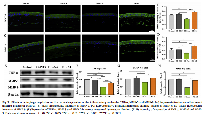 動(dòng)物實(shí)驗(yàn)通過(guò)建立DE模型小鼠進(jìn)行研究。結(jié)果顯示干眼模型對(duì)角膜染色用熒光素鈉和淚液產(chǎn)生(見圖二),檢測(cè)DE小鼠角膜上的自噬(見圖三);DE中角膜屏障的破壞與炎癥介質(zhì)的產(chǎn)生增加有關(guān),尤其是TNF-α、MMP-3和MMP-9。實(shí)驗(yàn)結(jié)果顯示,炎癥信號(hào)的角膜表達(dá)(見圖四);研究進(jìn)一步發(fā)現(xiàn),LYN-1604增強(qiáng)和3-MA抑制DE小鼠角膜中的自噬(見圖五),自噬激活劑對(duì)淚液產(chǎn)生和眼表?yè)p傷的影響(見圖六),自噬激活對(duì)炎癥水平的影響(見圖七)。